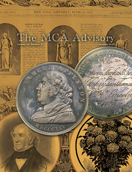 Medal Collectors of America was founded in 1998 as a club dedicated to the study and collection of artistic and historical medals. Our goal is to encourage research and publication in the medal field, while bringing together all who are interested, through meetings, publications, and other activities. Our magazine, The MCA Advisory, is published quarterly in both print and electronic versions, and we encourage submissions from both newcomers and experienced researchers. We hold two meetings a year, which are open to all, featuring guest speakers on a wide range of topics relating to medal collecting. One is held in August in conjunction with the American Numismatic Association convention, and the second in January in conjunction with the New York International Numismatic convention. One of the greatest benefits to membership is the opportunity to acquire our annual medal, which is struck in very limited quantities and available only to members.